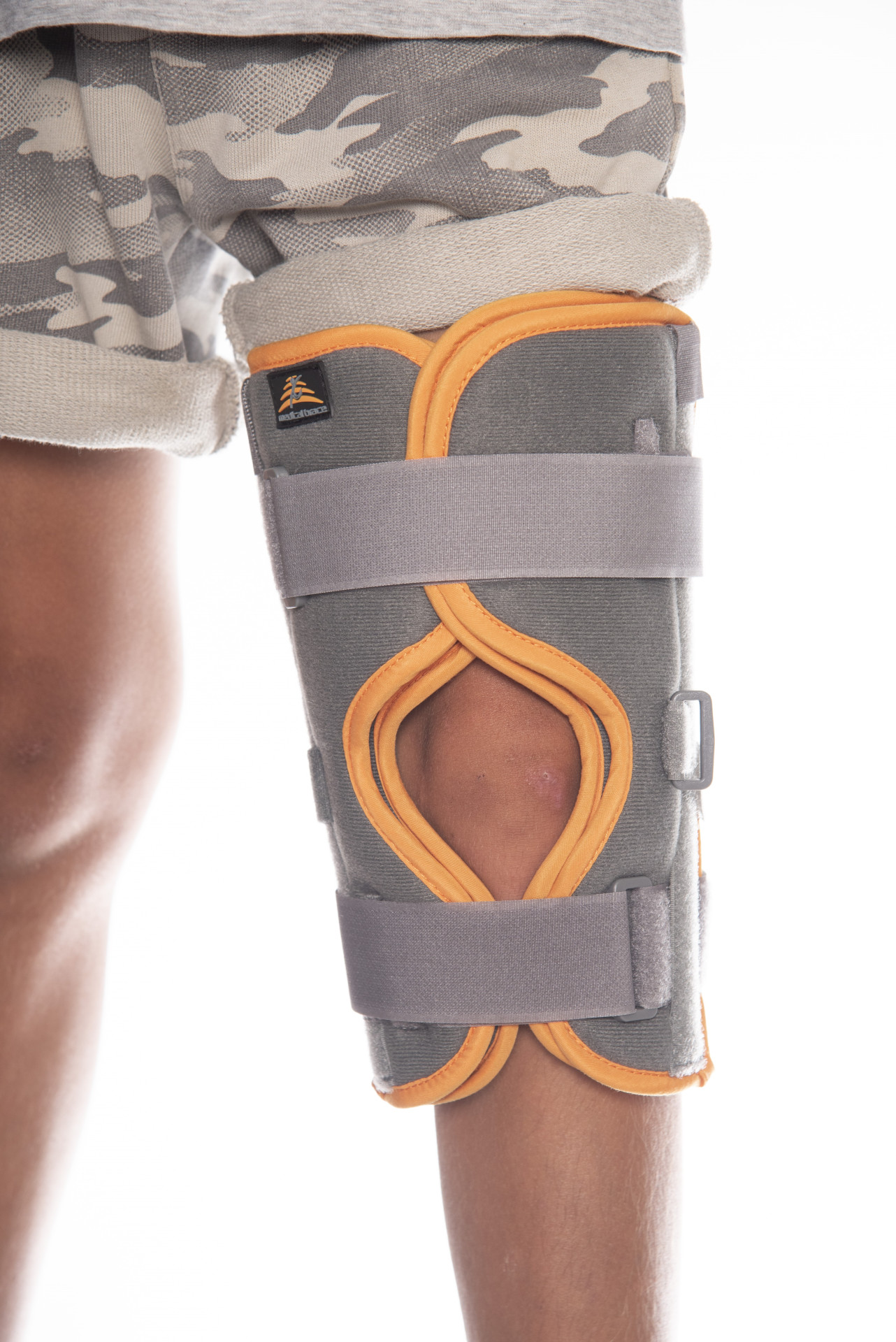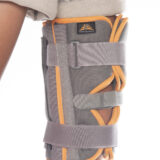 Διαθέτει εσωτερικές και πλάγιες μεταλλικές μπανέλες από αλουμίνιο που εξασφαλίζουν την ακινητοποίηση και τη στήριξη του γόνατος. Οι αυτοκόλλητοι ιμάντες με Velcro, αντίθετης φοράς, παρέχουν σταθερή εφαρμογή, ενώ οι extra ιμάντες ενώνοντας τα δύο τμήματα του νάρθηκα διευκολύνουν την τοποθέτηση.