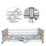 Ο στιβαρός μεταλλικός σκελετός με ξύλινες επενδυμένες μετώπες εξασφαλίζει σταθερότητα και προσδίδει μια οικεία αισθητική. Διαθέτει πλαϊνά κάγκελα από μέταλλο, τα οποία ρυθμίζονται σε ύψος ή αφαιρούνται πλήρως για εύκολη μετακίνηση του ασθενούς.
