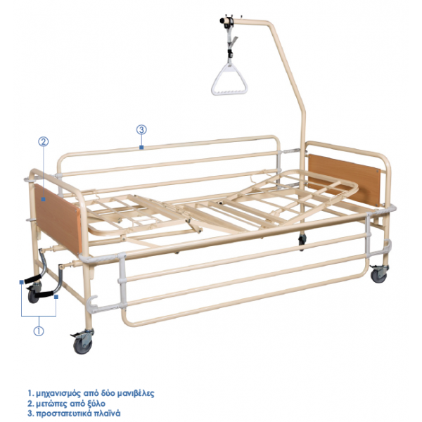 Αυτό το κρεβάτι είναι ιδανικό για οικιακή ή επαγγελματική φροντίδα, συνδυάζοντας λειτουργικότητα και σταθερότητα. Διαθέτει χειροκίνητο μηχανισμό μανιβέλας για ανύψωση τόσο της πλάτης όσο και των ποδιών, προσφέροντας άνεση στον χρήστη και ευκολία στον φροντιστή. Το σταθερό ύψος και οι μετώπες με ξύλινο πάνελ προσδίδουν στιβαρότητα και αισθητική. Το κενό κάτω από το κρεβάτι το καθιστά συμβατό με γερανό ανύψωσης, ενώ η εύκολη συναρμολόγηση και αποσυναρμολόγηση από ένα άτομο διευκολύνει σημαντικά τη μεταφορά και την αποθήκευση.
