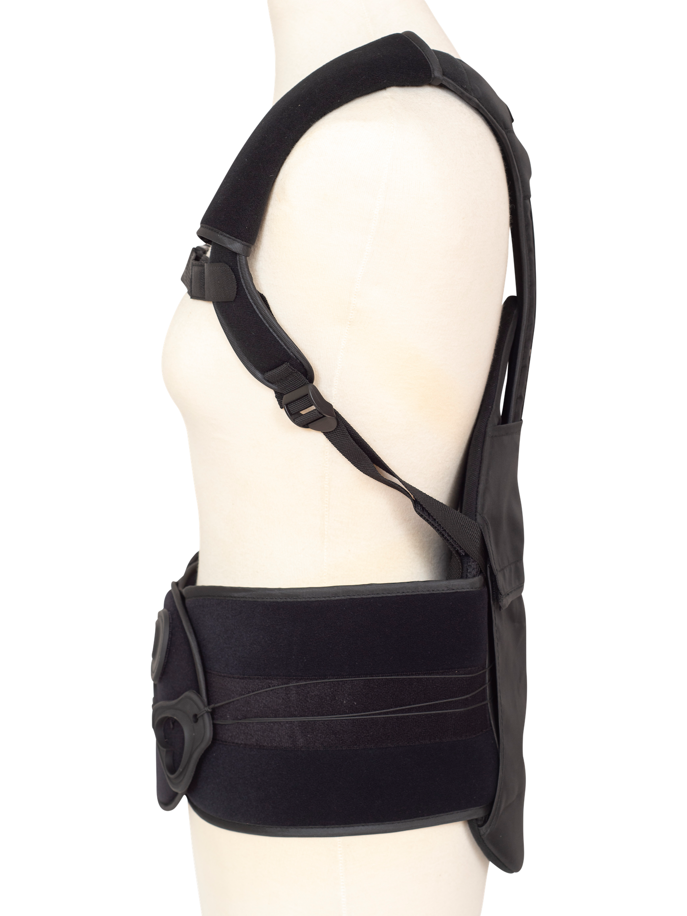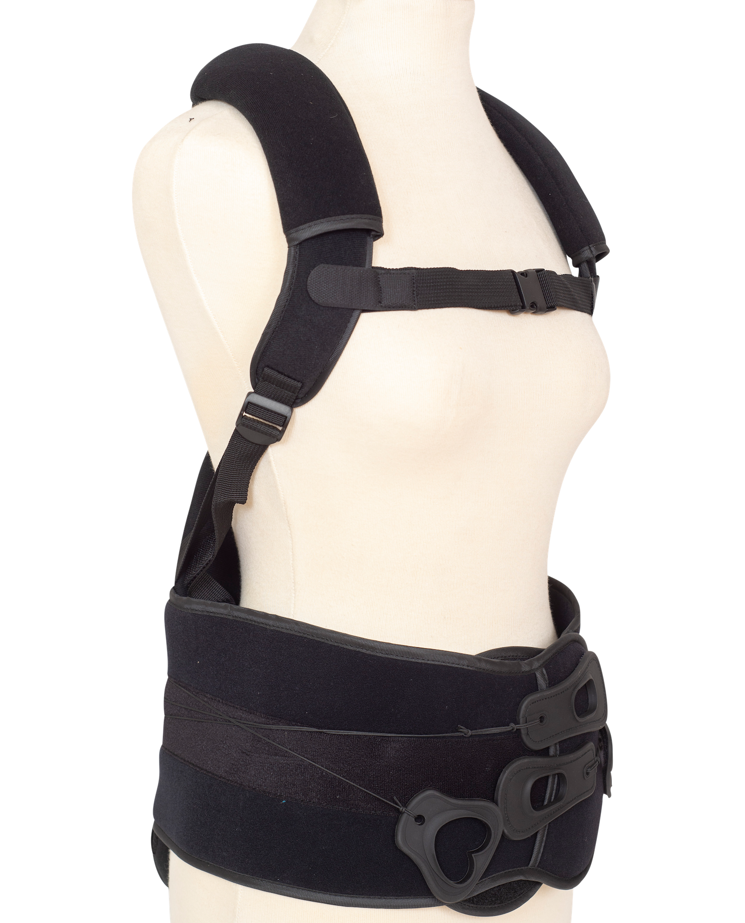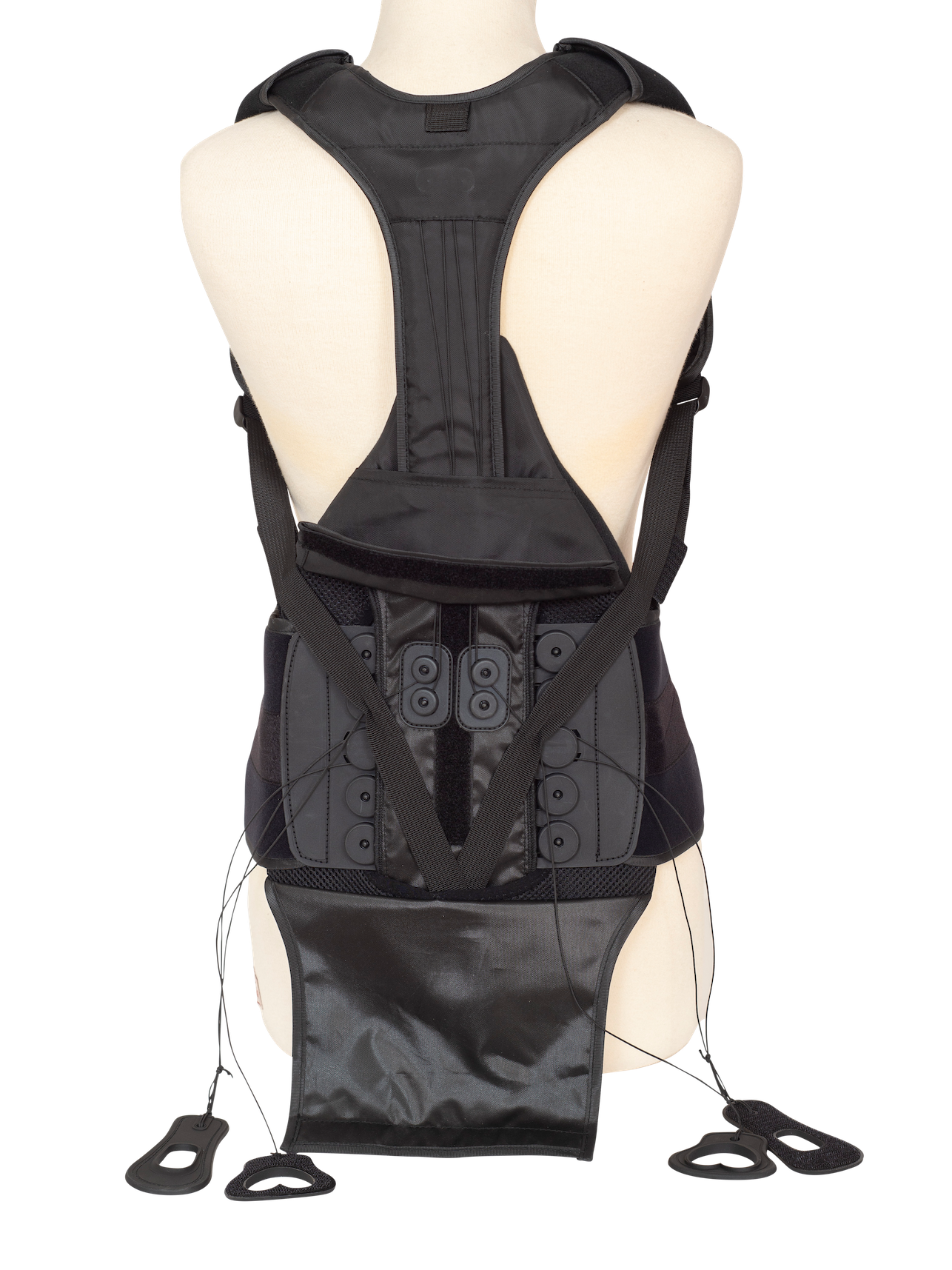 Ο νάρθηκας διαθέτει ιμάντες έλξης στους ώμους με μαξιλαράκια PAD AIR-COMFORT, που παρέχουν βαθμιαία έλξη και άνεση κατά τη χρήση. Η πρόσθια αυτοκόλλητη ζώνη με Velcro εξασφαλίζει εύκολη εφαρμογή, ενώ το διπλό σύστημα κορδονιών επιτρέπει ελεγχόμενη συμπίεση τόσο στη ραχιαία περιοχή (υπερέκταση κορμού) όσο και στην οσφυϊκή μοίρα (ενδοκοιλιακή συμπίεση).